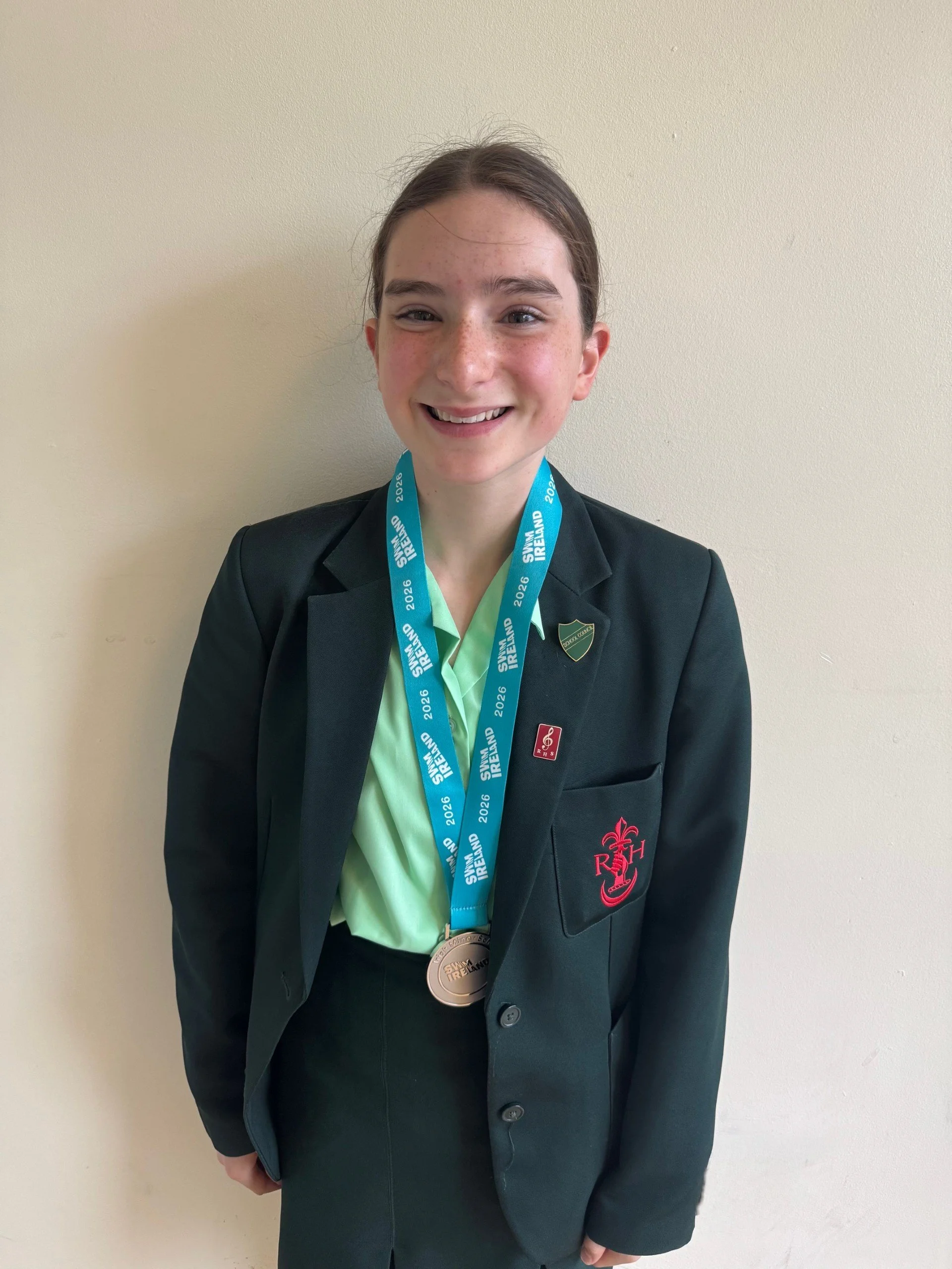 Iona Chanas in 8D competed in the Irish Minor Schools’ Swimming Championships at the end of March. The championships were held at the National Aquatic Centre in Dublin. Competing in the 12-year-old category, Iona finished in 2nd place in the 50m Freestyle, winning the silver medal.